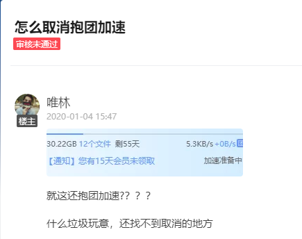 这个抱团就是和百度网盘一个玩意,没开之前正常都是几兆每秒,开了抱团,不是会员就一次机会速度快,在下载别的都开始几KB了,完全就是故意限速,让开通会员。