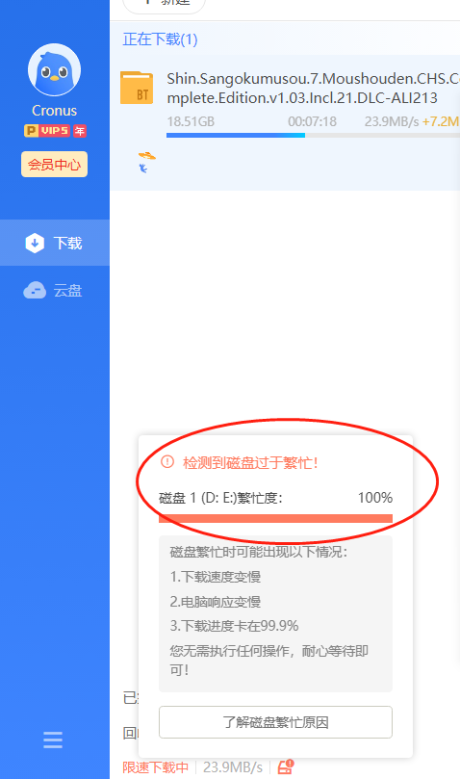 您好,关于您反馈的问题,磁盘繁忙是因为下载数据较多,磁盘写入慢引起,这个时候您耐心等待即可,无需其他的操作。