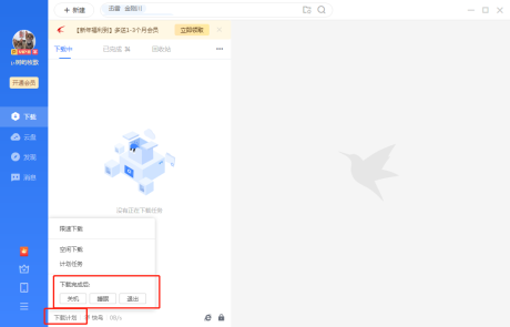 您好,下载完成后关机的按钮,在客户端左下角的下载计划内的,您点击“下载计划”就可以找到下载完成自动关机的选项。