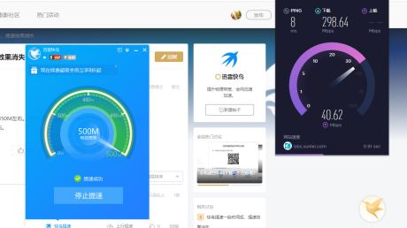 平时不开迅雷快鸟,实际大约350M左右。使用迅雷快鸟PC客户端提速至500M,有效果,但是一段时间后速度又降到300左右。