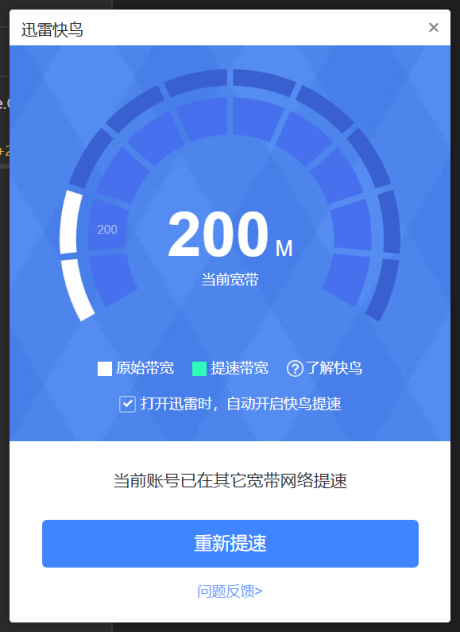 10分钟后,通过迅雷PC端,点击快鸟,查询快鸟加速时候,点了下提速(200-500),就提示该账号已经在其他地方加速。